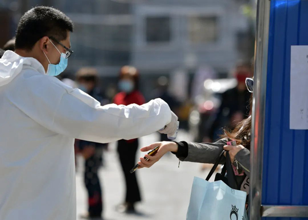 在武漢市武昌楚材社區,工作人員為出入者測體溫