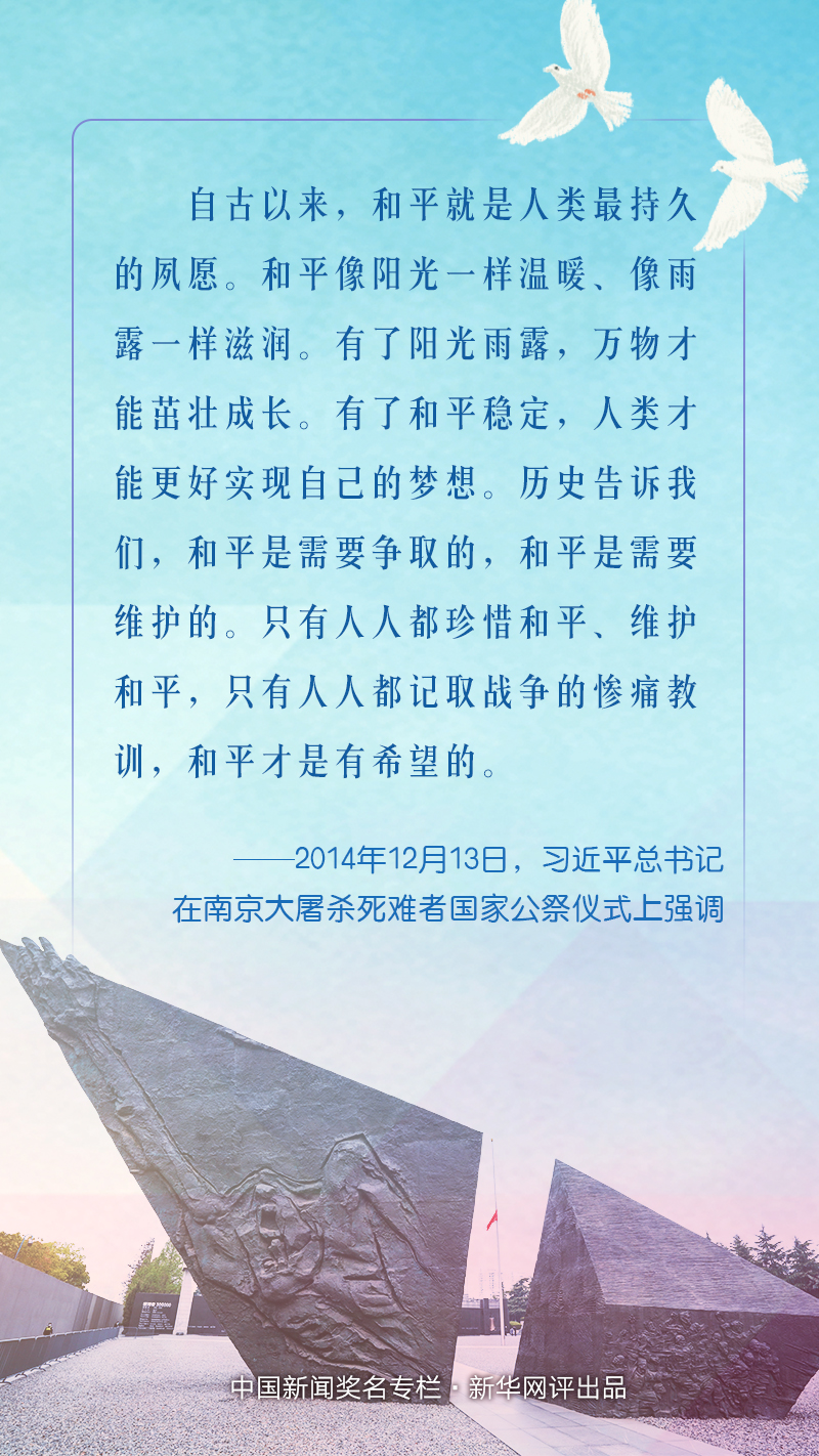 和平是人類的永恒期望。今天,和平與發(fā)展已經(jīng)成為時(shí)代主題,但世界仍很不太平,戰(zhàn)爭的達(dá)摩克利斯之劍依然懸在人類頭上。歷史告訴我們,和平需要爭取,更需要維護(hù)。只有人人都珍惜和平、維護(hù)和平,只有人人都汲取戰(zhàn)爭的慘痛教訓(xùn),和平才會(huì)更有希望。我們要以史為鑒,堅(jiān)定維護(hù)和平的決心,堅(jiān)定不移走和平發(fā)展道路,才能推動(dòng)建設(shè)持久和平、普遍安全、共同繁榮、開放包容、清潔美麗的新世界,讓和平的陽光永遠(yuǎn)普照人類生活的星球。