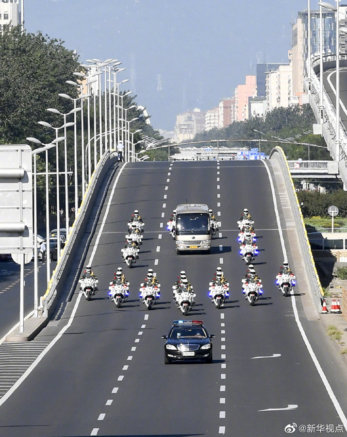 國家勛章和國家榮譽(yù)稱號獲得者集體乘坐禮賓車從住地出發(fā),由國賓護(hù)衛(wèi)隊(duì)護(hù)衛(wèi)前往人民大會堂。