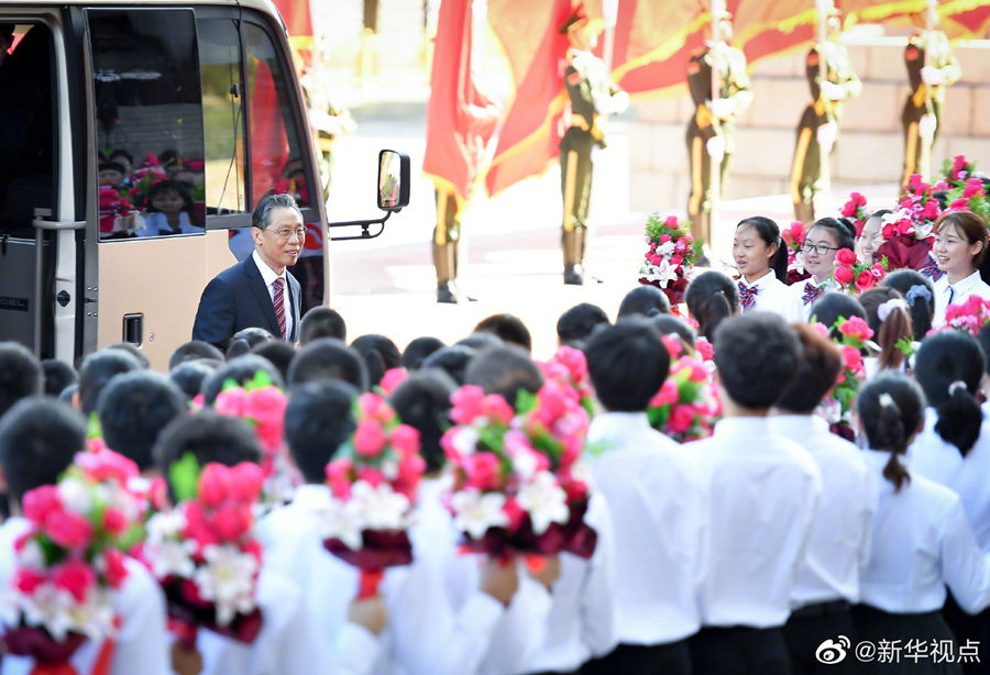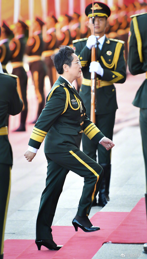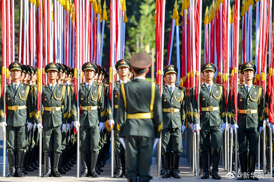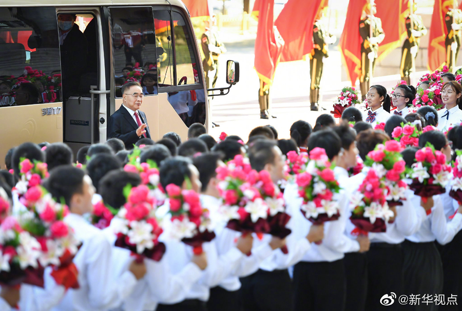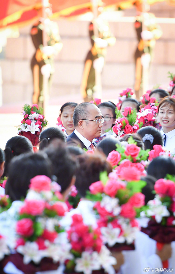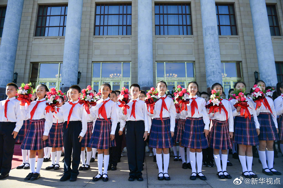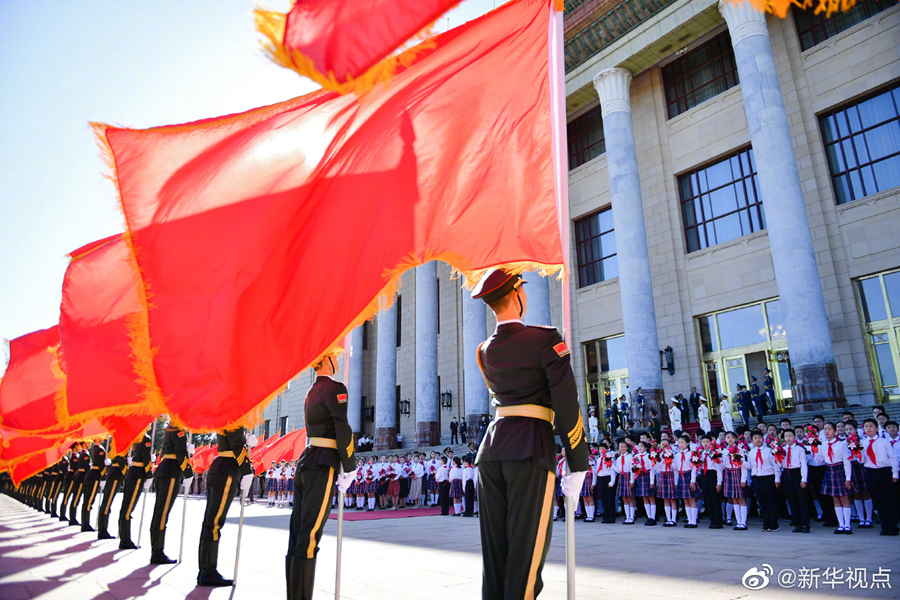 人民大會堂北門外,高擎紅旗的禮兵分列道路兩側,肩槍禮兵在臺階上莊嚴佇立,青少年熱情歡呼致意。國家勛章和國家榮譽稱號獲得者沿著紅毯拾級而上,進入人民大會堂。