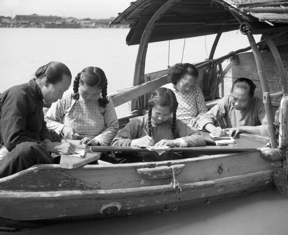 ↑ 1958年,福建省福州市生活在水上的婦女在船頭練習寫字。解放前,福州市的水上居民中婦女100%都是文盲。解放后,她們走進了識字班,在當?shù)匦W教師的輔導下開展掃盲學習。