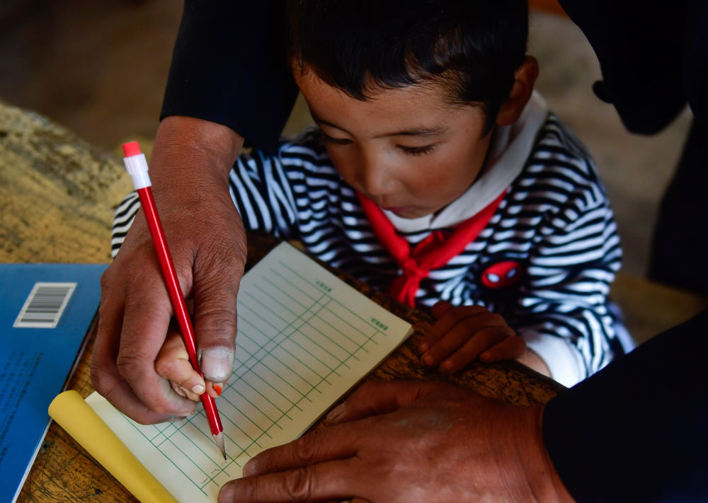 ↑ 2020年8月31日,在青海省海東市循化撒拉族自治縣白莊鎮(zhèn)來塘村學校,完么仁增老師在指導一年級學生馬文輝學習。