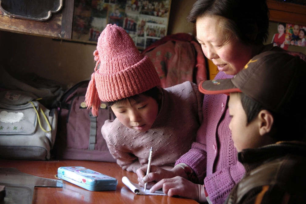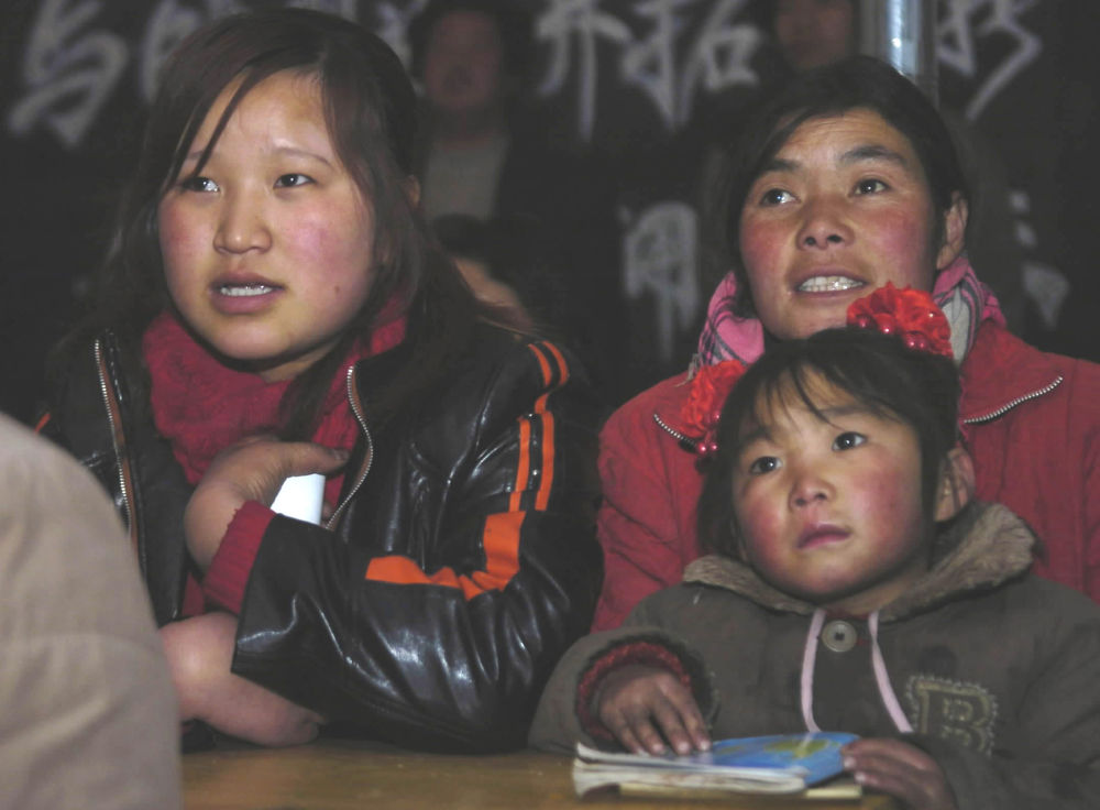 ↑ 2006年1月13日,“掃盲夜校”學員在甘肅漳縣三岔鎮(zhèn)中心小學上課。