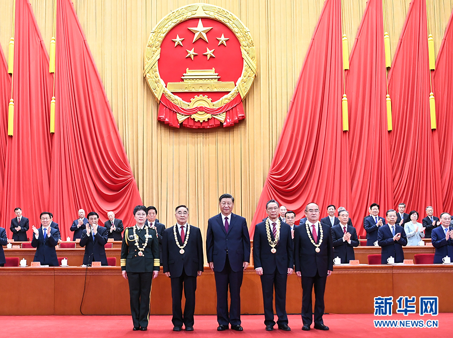 栗戰書宣讀習近平簽署的中華人民共和國主席令。主席令指出,為了隆重表彰在抗擊新冠肺炎疫情斗爭中作出杰出貢獻的功勛模范人物,弘揚他們忠誠、擔當、奉獻的崇高品質,根據第十三屆全國人民代表大會常務委員會第二十一次會議的決定,授予鐘南山“共和國勛章”,授予張伯禮、張定宇、陳薇“人民英雄”國家榮譽稱號。