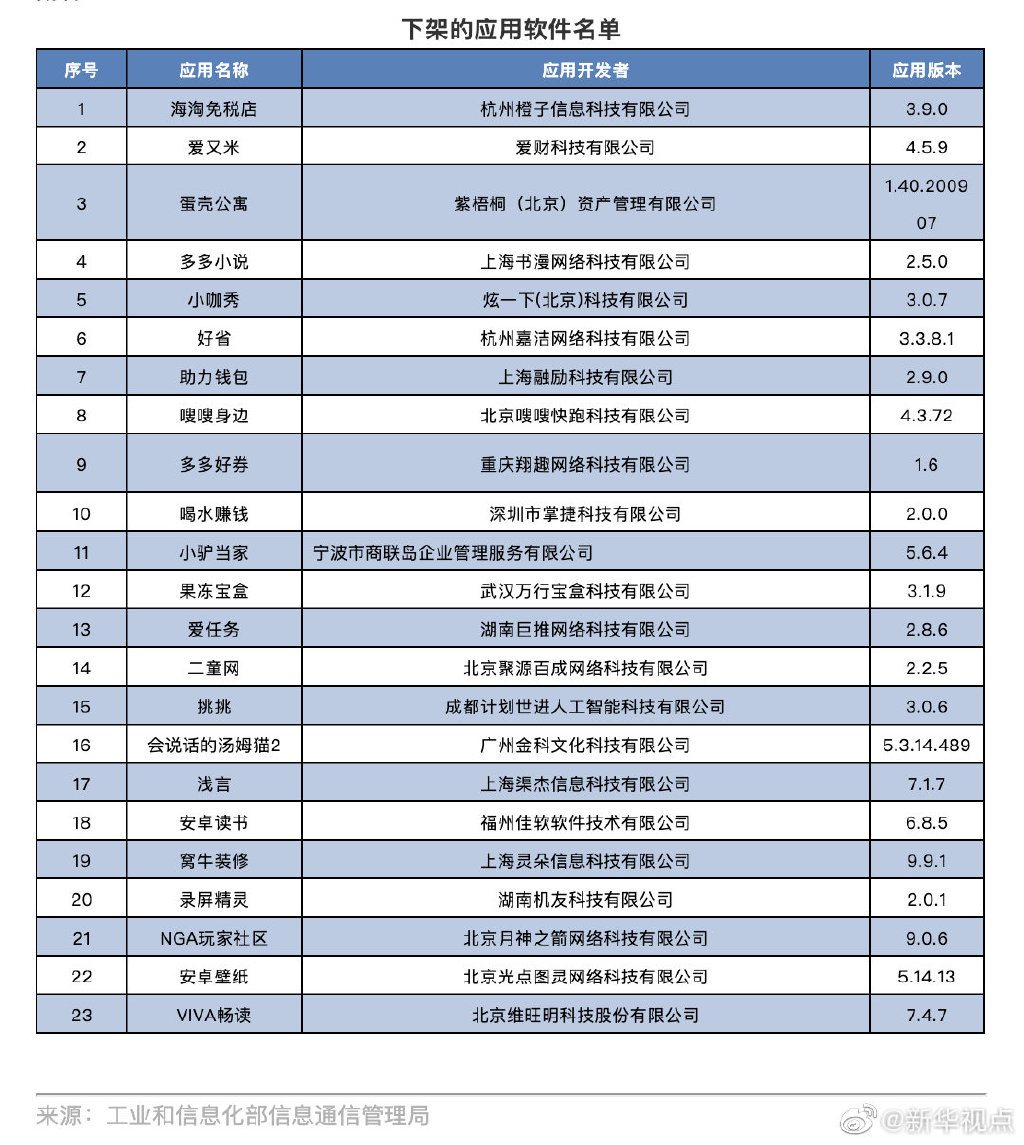 工信部14日消息,工信部此前向社會通報了101家存在侵害用戶權益行為APP企業的名單。截至目前,經第三方檢測機構核查復檢,尚有海淘免稅店、愛又米等23款APP未按要求完成整改。根據相關規定,工信部組織對這些APP進行下架。(記者 張辛欣) ????