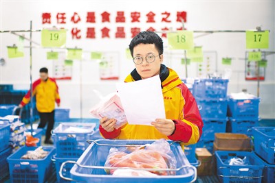 陜西黃馬甲物流配送股份有限公司生鮮中央工廠的工作人員認(rèn)真核對(duì)供應(yīng)鏈產(chǎn)品。馬 壯攝