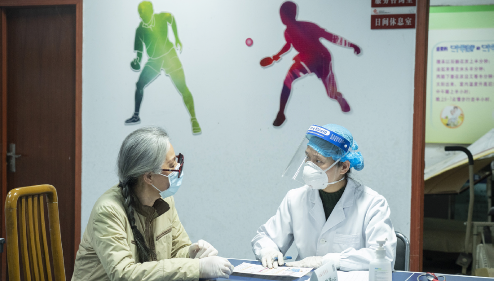 4月14日,在武漢市江岸區(qū)花橋街花橋社區(qū)居家養(yǎng)老服務(wù)中心,武漢亞洲心臟病醫(yī)院醫(yī)護(hù)人員在為社區(qū)老人義診 (才揚(yáng)/攝)