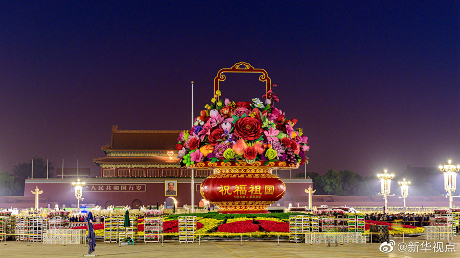 據悉,大花籃以喜慶的花果籃為主景,花籃為鋼架結構,籃身為玻璃鋼材質,籃盤直徑12米,花壇底部直徑45米。在籃體南側書寫“祝福祖國,1949-2020”字樣,在籃體北側書寫 “萬眾一心,1949-2020”字樣。籃內共使用了125枝大型仿真花,籃底部花壇則使用我國自育花園小菊“絢秋星光”與一品紅組成10顆紅心的圖案。