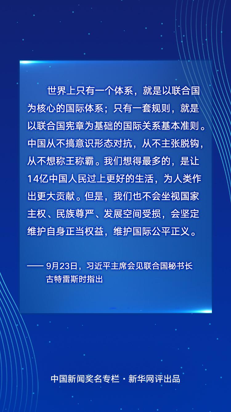 中國是聯合國的堅定支持者。無論國際形勢如何風云變幻,中國始終堅定站在歷史正確的一邊,做世界和平的建設者、全球發展的貢獻者、國際秩序的維護者,推動聯合國事業和人類和平發展事業不斷開拓前進。中國理念、中國行動,與聯合國所倡導的多邊主義等原則高度契合,與和平、發展、合作、共贏的時代潮流相適應。在第75屆聯合國大會期間,中國就人類將面對什么樣的世界、世界需要什么樣的聯合國等重大問題闡述中國立場、提出中國方案,用中國智慧、中國行動為聯合國發展、世界和平與繁榮作出新的中國貢獻。中國期待同各國一道,建設一個強有力的聯合國,推動構建人類命運共同體,讓14億中國人民過上更好的生活,為人類作出更大貢獻。