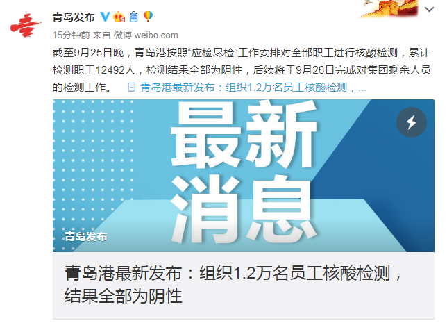 截至9月25日晚,青島港按照“應檢盡檢”工作安排對全部職工進行核酸檢測,累計檢測職工12492人,檢測結果全部為陰性,后續將于9月26日完成對集團剩余人員的檢測工作。
