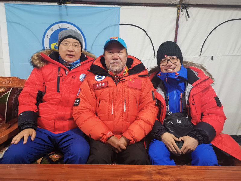 谷業凱(右)與中國登山隊隊長王勇峰(中)、人民日報記者袁泉(左)登頂前夜在珠峰大本營。