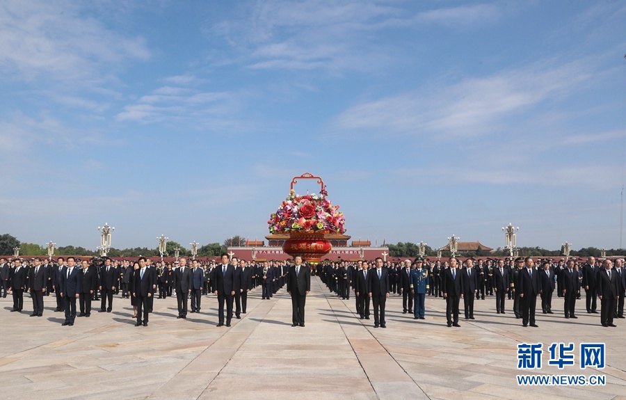 9月30日上午,黨和國家領導人習近平、李克強、栗戰書、汪洋、王滬寧、趙樂際、韓正、王岐山等來到北京天安門廣場,出席烈士紀念日向人民英雄敬獻花籃儀式。 新華社記者 鞠鵬 攝