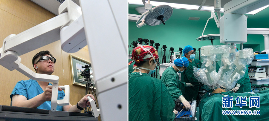 當日,青島大學附屬醫院醫療團隊利用5G技術和國產原研手術機器人,成功完成一例超遠程泌尿外科手術,為身處貴州省安順市西秀區人民醫院的膀胱癌患者實施了膀胱根治性切除手術。新華社發