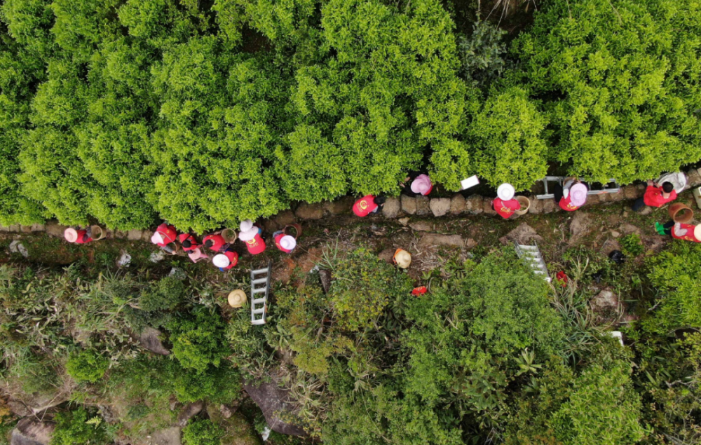 廣東省潮州市潮安區鳳凰鎮山上,采茶工在采茶。無人機照片 新華社記者 鄧華 攝