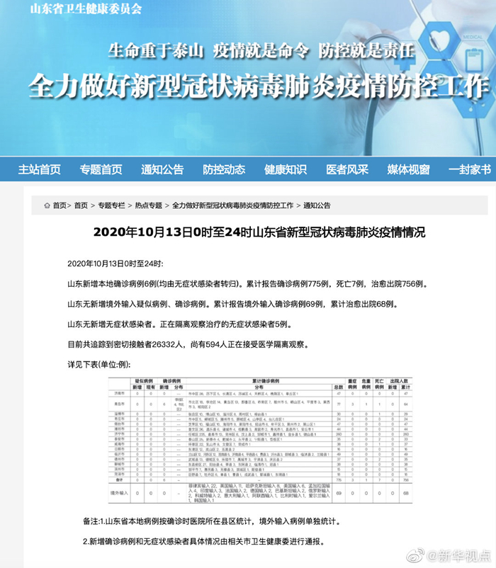 2020年10月13日0時至24時:山東新增本地確診病例6例(均由無癥狀感染者轉歸)。累計報告確診病例775例,死亡7例,治愈出院756例。