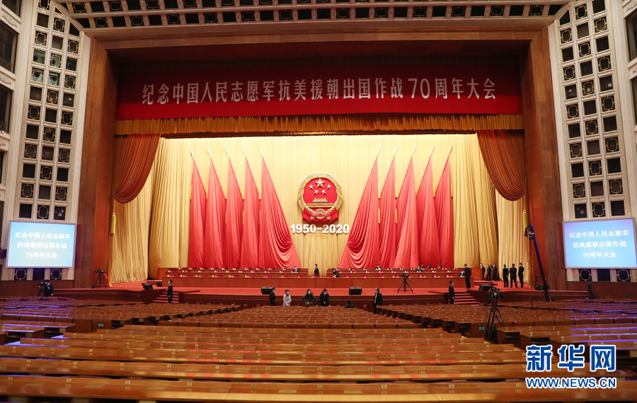 ??? 10月23日,紀念中國人民志愿軍抗美援朝出國作戰70周年大會在北京人民大會堂隆重舉行。圖為人民大會堂大禮堂。(新華網 翟子赫 攝)