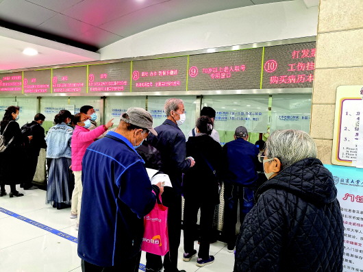 此時,這家醫(yī)院唯一一個現(xiàn)場掛號的窗口——面向70周歲以上老年人的窗口,已經(jīng)排起了長隊(duì)。老人們一個比一個來得早,仍有點(diǎn)兒神色緊張。