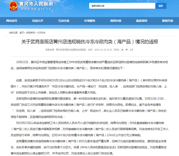 10月22日,黃州區(qū)市場(chǎng)監(jiān)督管理局在排查工作中發(fā)現(xiàn)武商量販店黃州店嚴(yán)重違反區(qū)新冠肺炎疫情防控指揮部第24號(hào)通告有關(guān)規(guī)定,違規(guī)銷售兩批未經(jīng)疾控部門檢測(cè)的冷凍冷藏肉類(海產(chǎn)品)。現(xiàn)將有關(guān)處理情況通報(bào)如下:
