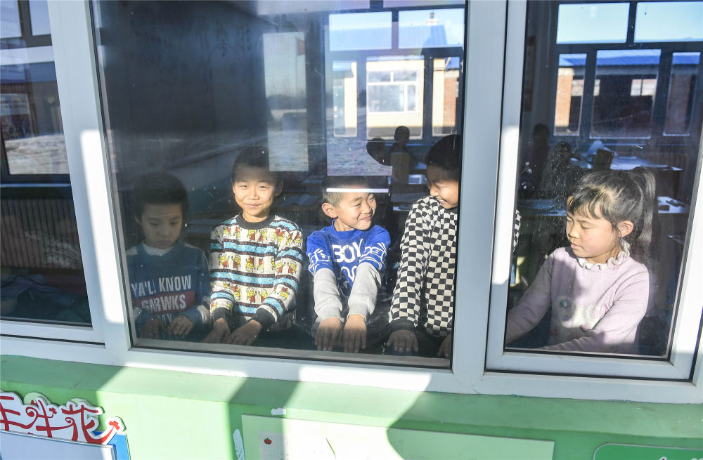 吉林省德惠市邊崗鄉臥虎村小學學生在戶外活動后圍著教室內的環流散熱器取暖(2018年12月26日攝)。新華社記者 許暢 攝
