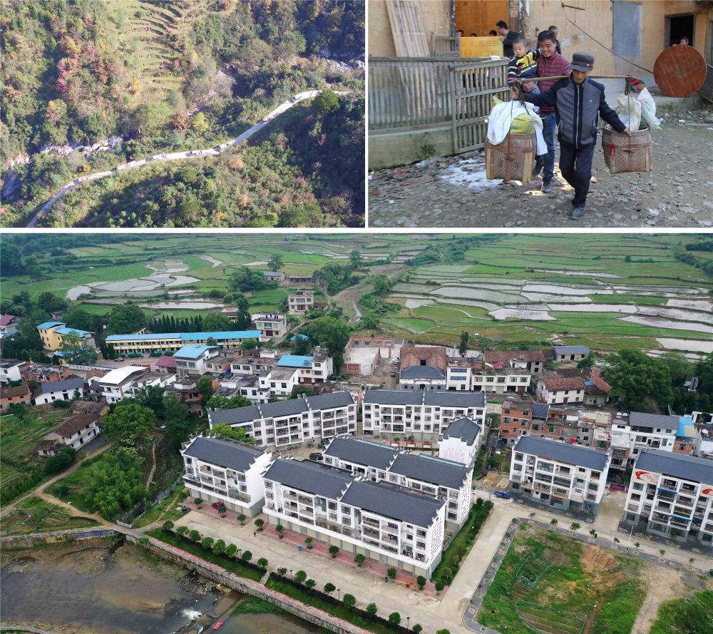 拼版照片的上左圖:在江西省修水縣上奉鎮麻洞村,村民胡尚海一家和鄰居們在乘車搬離大山溝(2017年11月攝,資料照片)。