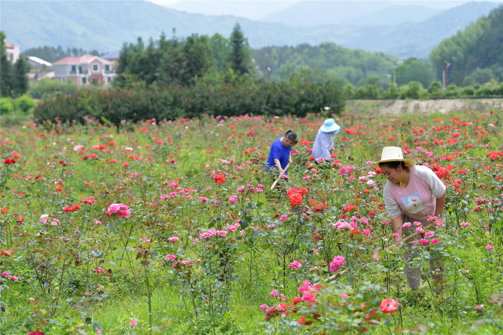 在江西省修水縣黃沙鎮湯橋村的易地扶貧搬遷安置點,村民在花卉種植基地里勞作(5月20日攝)。新華社記者 彭昭之 攝