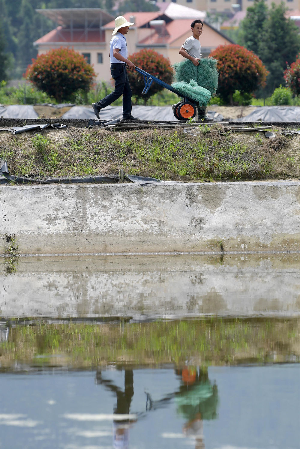 在江西省修水縣黃沙鎮湯橋村,返鄉創業大學生李平(右)和水產合作社的工作人員準備去放對蝦蝦苗。他創辦的水產合作社幫助周邊村民就業(5月20日攝)。新華社記者 彭昭之 攝