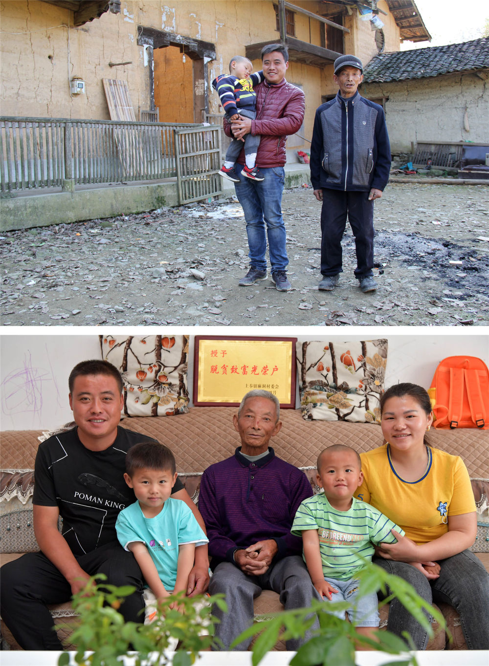 拼版照片的上圖:在江西省修水縣上奉鎮麻洞村的舊屋前,村民胡尚海抱著兒子和父親一起合影(2017年11月攝,資料照片)。