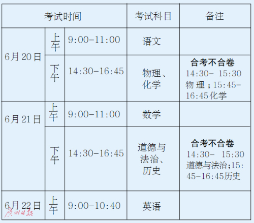 2021年至2023年廣州市初中學業水平考試錄取計分科目考試安排在每年的6月20日至22日進行。錄取計分科目采用“4+4”模式,新增歷史科考試,分值為90分,體育分值提升至70分。語、數、英各科分值調整為120分。道德與法治分值調整為90分。物理和化學分值不變,各100分。