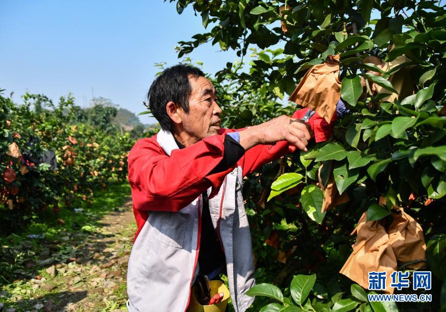 在四川省資陽市安岳縣寶森檸檬小鎮(zhèn)世界檸檬品種博覽園,安岳縣檸檬產(chǎn)業(yè)發(fā)展中心主任田再澤在查看檸檬的長勢(shì)情況(11月11日攝)。新華社記者 周相吉 攝