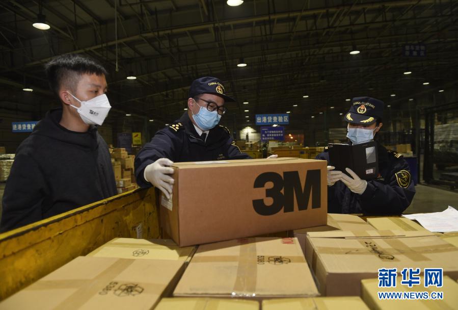 抗擊新冠疫情期間,成都海關關員在雙流機場口岸查驗防護物資,做到即到即提,實現(xiàn)疫情物資通關“零延時”(1月30日攝)。新華社記者 劉坤 攝