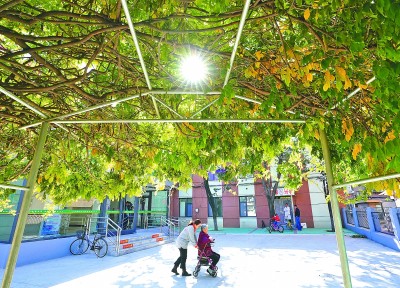 河北唐山市路北區(qū)煤研分院社區(qū)幸福家園養(yǎng)老服務(wù)中心,工作人員陪護(hù)一位老人在院內(nèi)活動(dòng)。新華社發(fā)