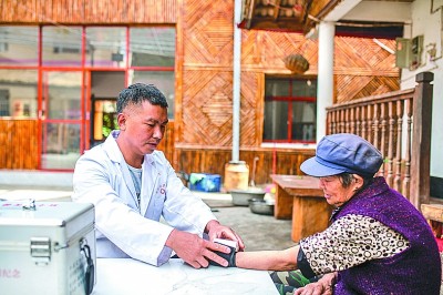 云南貢山獨(dú)龍族怒族自治縣獨(dú)龍江鄉(xiāng)巴坡村,村醫(yī)在給獨(dú)龍族老人測(cè)量血壓。 新華社發(fā)
