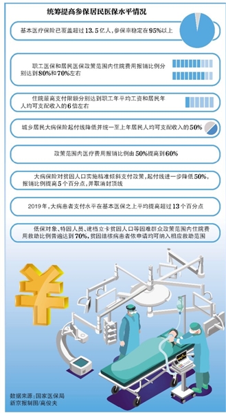 城鄉居民大病保險起付線降低并統一至上年居民人均可支配收入的50%,政策范圍內醫療費用報銷比例由50%提高到60%。同時,大病保險對貧困人口實施精準傾斜支付政策,起付線進一步降低50%,報銷比例提高5個百分點,并取消封頂線。2019年,大病患者支付水平在基本醫保之上平均提高超過13個百分點。