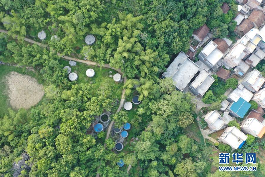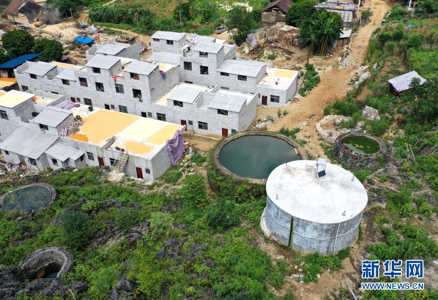 這是7月23日在廣西都安瑤族自治縣三只羊鄉雞峒村拍攝的水柜(無人機照片)。利用山石修建的第1代水柜、用水泥砂石修建的第2水柜以及第3代加蓋并配備抽水設備的水柜,見證了大石山區村民飲水的變遷。新華社記者 周華 攝