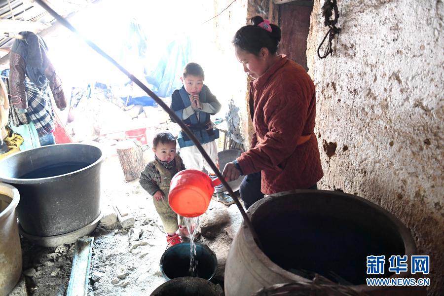 在廣西南丹縣里湖瑤族鄉,一個村民從水缸里舀水(2018年2月5日攝)。新華社記者 周華 攝
