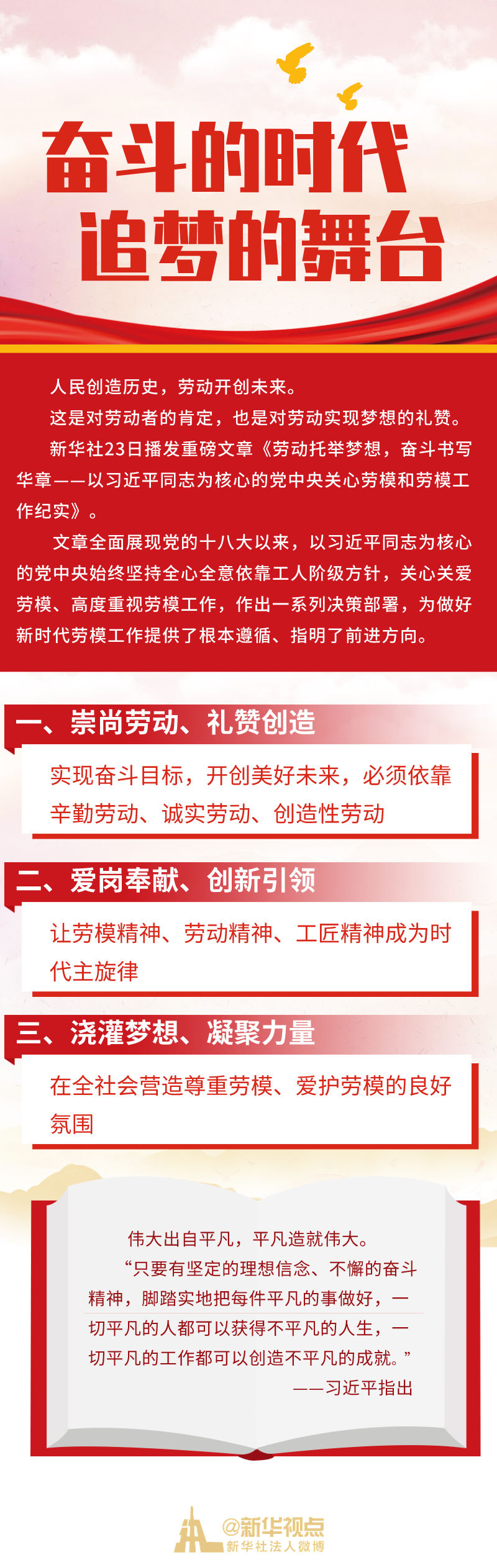 新華社23日播發(fā)重磅文章《勞動(dòng)托舉夢(mèng)想,奮斗書(shū)寫(xiě)華章——以習(xí)近平同志為核心的黨中央關(guān)心勞模和勞模工作紀(jì)實(shí)》。