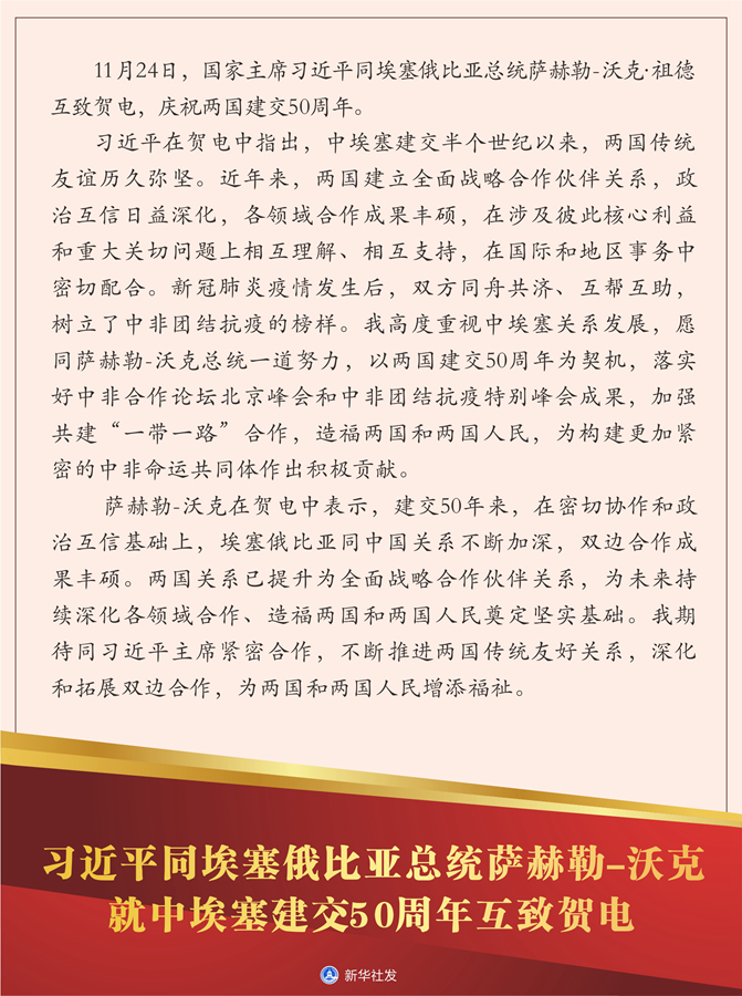 新華社北京11月24日電? 11月24日,國家主席習近平同埃塞俄比亞總統薩赫勒-沃克·祖德互致賀電,慶祝兩國建交50周年。