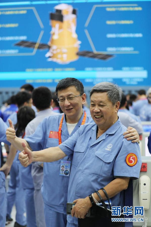 這是航天科技人員在文昌航天發射場慶祝發射成功。新華社記者金立旺攝