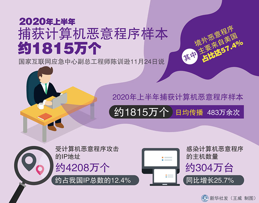 新華社杭州11月25日電(記者溫競華、朱涵)國家互聯網應急中心副總工程師陳訓遜24日說,國家互聯網應急中心對我國網絡安全態勢監測數據顯示,2020年上半年捕獲計算機惡意程序樣本約1815萬個,日均傳播次數483萬余次。其中境外惡意程序主要來自美國,占比達57.4%。