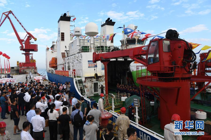 11月28日,在三亞市南山港,“探索一號”科考船的科考人員下船接受歡迎人群的迎接。新華社記者 趙穎全 攝