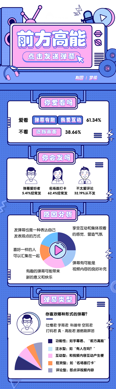 中青校媒調查顯示,受訪大學生對不同類型的“彈幕君”喜好程度不一,其中“科普帝”以59.66%位列排行榜第一,“真·高能君”占52.77%,“字幕君”占52%,之后依次是“吐槽君”“激燃刷屏團”“空耳君”“打碼君”,分別占42.7%、19.06%、12.13%和7.86%。