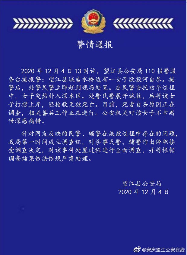 女子投河自盡,民警營(yíng)救不力?涉事者被停職調(diào)查