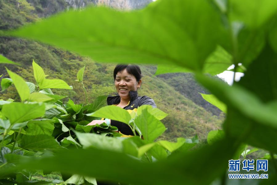 在廣西百色市凌云縣下甲鎮加西村,當地村民在采摘桑葉(2019年3月27日攝)。新華社記者 陸波岸 攝