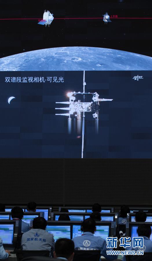 記者從國家航天局獲悉,12月6日5時42分,嫦娥五號上升器成功與軌道器返回器組合體交會對接,并于6時12分將月球樣品容器安全轉移至返回器中。這是我國航天器首次實現月球軌道交會對接。新華社記者 金立旺 攝
