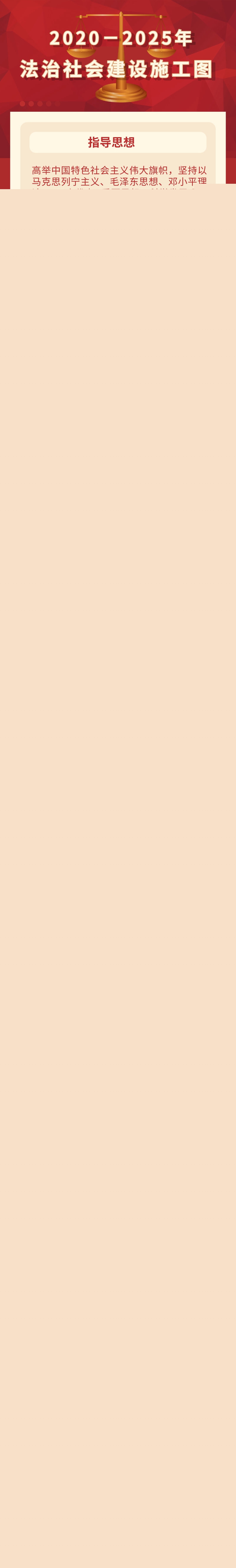 (一)指導思想。高舉中國特色社會主義偉大旗幟,堅持以馬克思列寧主義、毛澤東思想、鄧小平理論、“三個代表”重要思想、科學發展觀、習近平新時代中國特色社會主義思想為指導,全面貫徹黨的十九大和十九屆二中、三中、四中、五中全會精神,全面貫徹習近平法治思想,增強“四個意識”、堅定“四個自信”、做到“兩個維護”,堅定不移走中國特色社會主義法治道路,堅持法治國家、法治政府、法治社會一體建設,培育和踐行社會主義核心價值觀,弘揚社會主義法治精神,建設社會主義法治文化,增強全社會厲行法治的積極性和主動性,推動全社會尊法學法守法用法,健全社會公平正義法治保障制度,保障人民權利,提高社會治理法治化水平,為全面建設社會主義現代化國家、實現中華民族偉大復興的中國夢筑牢堅實法治基礎。