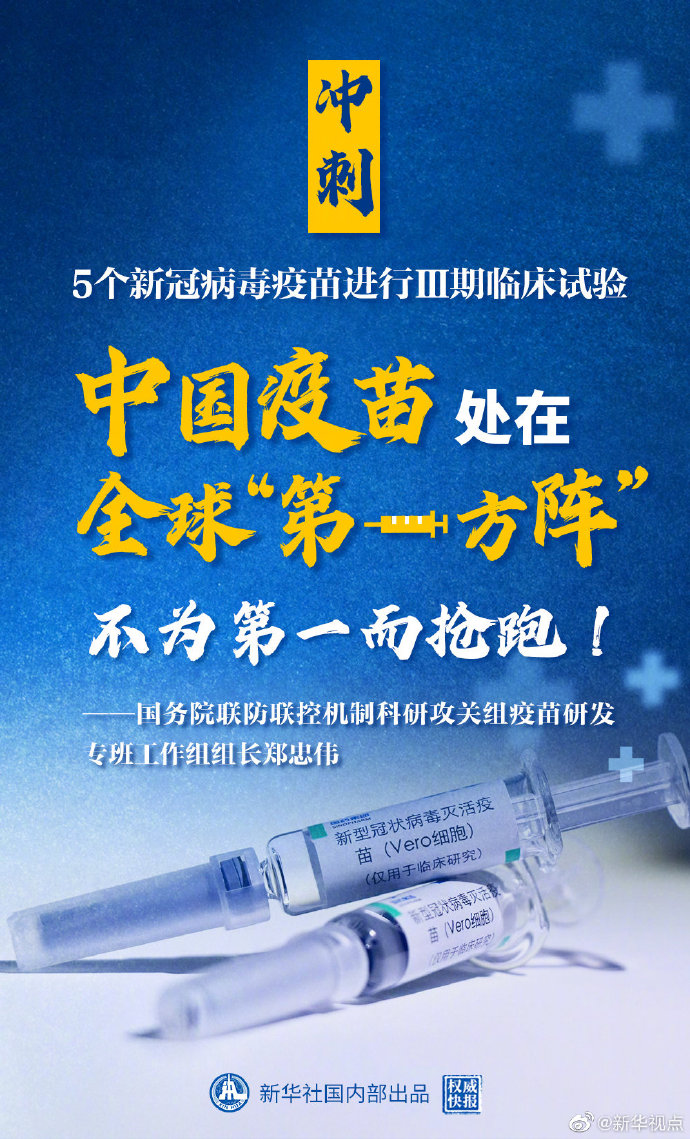 “我國目前已有5個新冠病毒疫苗進行Ⅲ期臨床試驗,數(shù)量位于全球前列。”國務院聯(lián)防聯(lián)控機制科研攻關組疫苗研發(fā)專班工作組組長鄭忠偉接受新華社記者專訪時說,“疫苗研發(fā)已經進入沖刺階段,我們處于全球第一方陣,但不為第一而搶跑?!薄霸u價一個疫苗需要多項綜合指標,其中安全性、有效性、可及性、可負擔性是最重要的?!保ㄓ浾撸宏惙?、董瑞豐 海報設計:張惠慧)