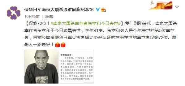 侵華日軍南京大屠殺遇難同胞紀念館18日發布消息,南京大屠殺幸存者賀孝和于2020年12月18日凌晨去世,享年91歲。