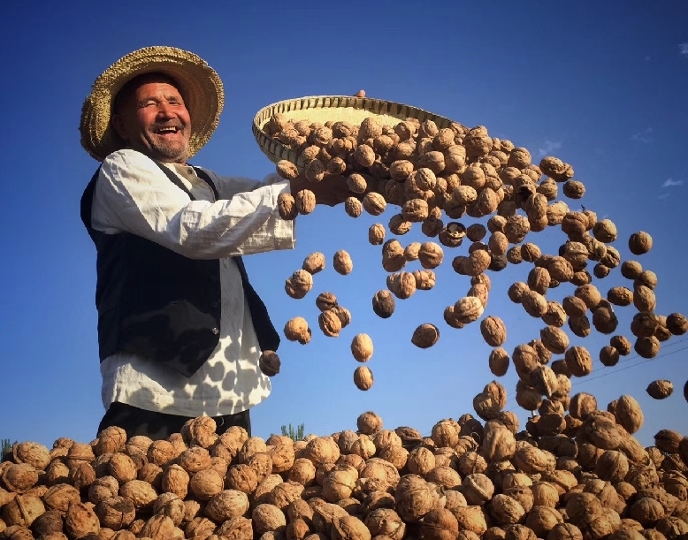 ????新疆喀什地區(qū)果農正在開心地晾曬核桃。