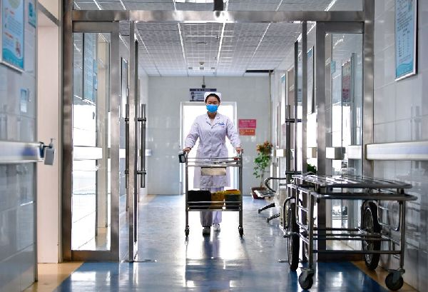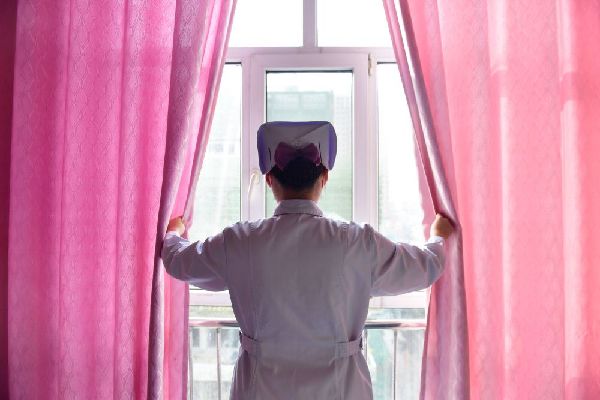 12月16日,海東市第一人民醫(yī)院內科護士劉海婷在病房內為患者拉開窗簾。