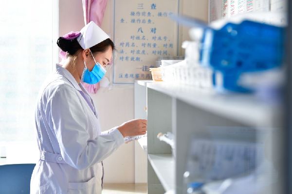 12月16日,海東市第一人民醫(yī)院內科護士劉海婷在藥房取藥。